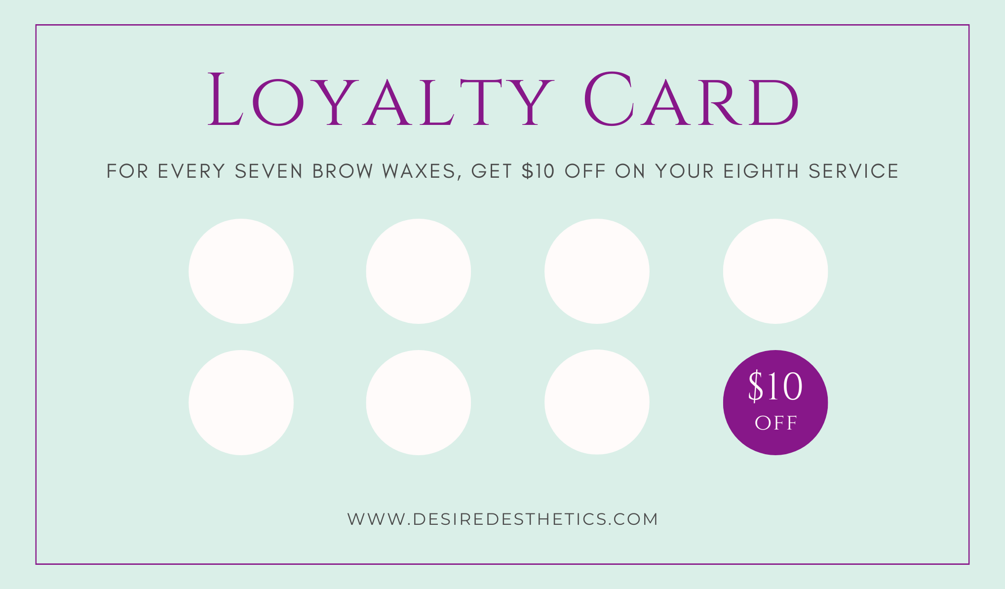 Loyalty cards are provided to clients after their first Brow Wax appointment and will be punched to track progress after each subsequent appointment. After the client’s eighth appointment, $10 will be discounted at checkout (in-studio) and a new card will be given to the client.